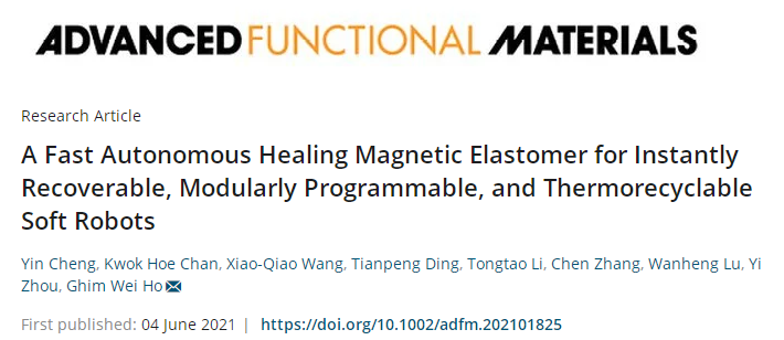 近日,新加坡国立大学Ho Ghim Wei课题组开发出一种室温下快速自愈合的磁性软弹性体超分子材料(SHSME),不仅展示了极其优异的自愈合能力,还有着远高于自愈合水凝胶材料的力学强度。这种SHSME材料实现了软体机器人的闭环式设计思路:(1)热可重塑性可以满足变化的器件形态需求;(2)快速自修复提高了软机器人的功能鲁棒性与工作寿命;(3)模块化设计实现了定制化的机器人构造与功能。这项研究以标题A Fast Autonomous Healing Magnetic Elastomer for Instantly Recoverable, ModularlyProgrammable, and Thermo-recyclable Soft Robots发表于《Advanced Functional Materials》,通讯作者为Ho Ghim Wei教授,文章第一作者为程荫博士。
