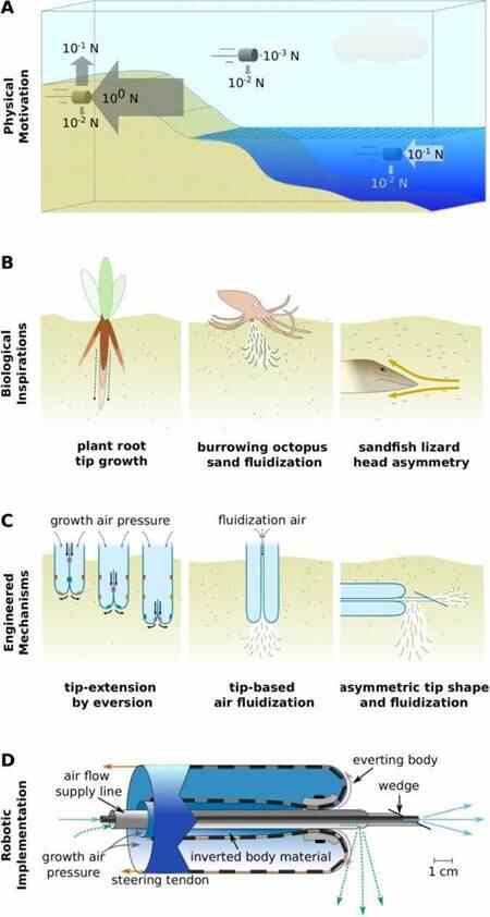 新的设计从现有的软体机器人开始,它通过从其顶端“生长”来移动,就像一根藤蔓。这已经有助于它的地下冒险--因为尖端是唯一的运动部分,摩擦力远远低于整个身体的运动。为了帮助它更容易地移动,一个装置被连接到机器人的“生长”尖端,在它前面吹气,将沙子推到一边,以清理出一条道路。