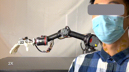 在信号采集后,使用KNN模型解码肌电信号中的运动意图,手腕的简单轻弹即告诉机械臂向上或向下移动,人类手指的握紧或张开会促使机械手做出类似的动作;机器⼈可以在毫秒级的时间内模仿人类的手势,研究人员训练了包含上,下,左,右,抓握,伸张等六种手势,以实现机械臂及机械手的准确操控。
